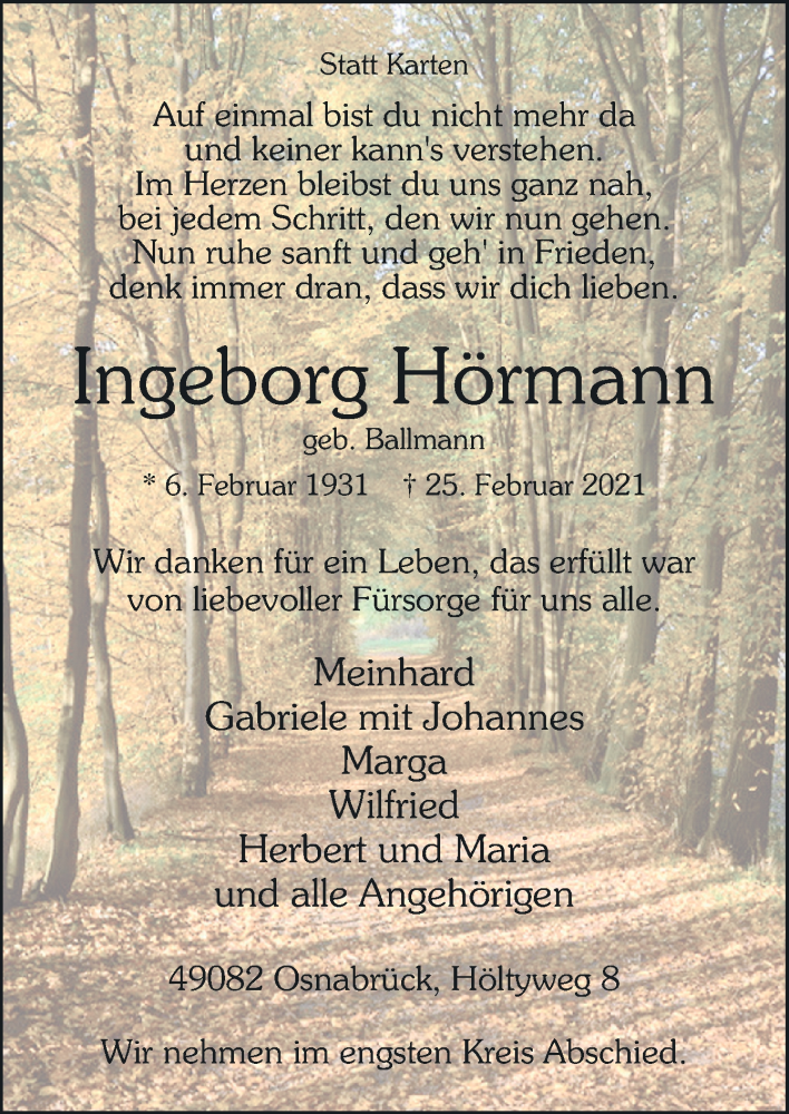 Hier finden Sie alle Traueranzeigen aus der Zeitung, die bisher für Ingeborg Hörmann erschienen sind. Weitere Traueranzeigen, die in der Zeitung erscheinen, werden hier ebenfalls aufgelistet