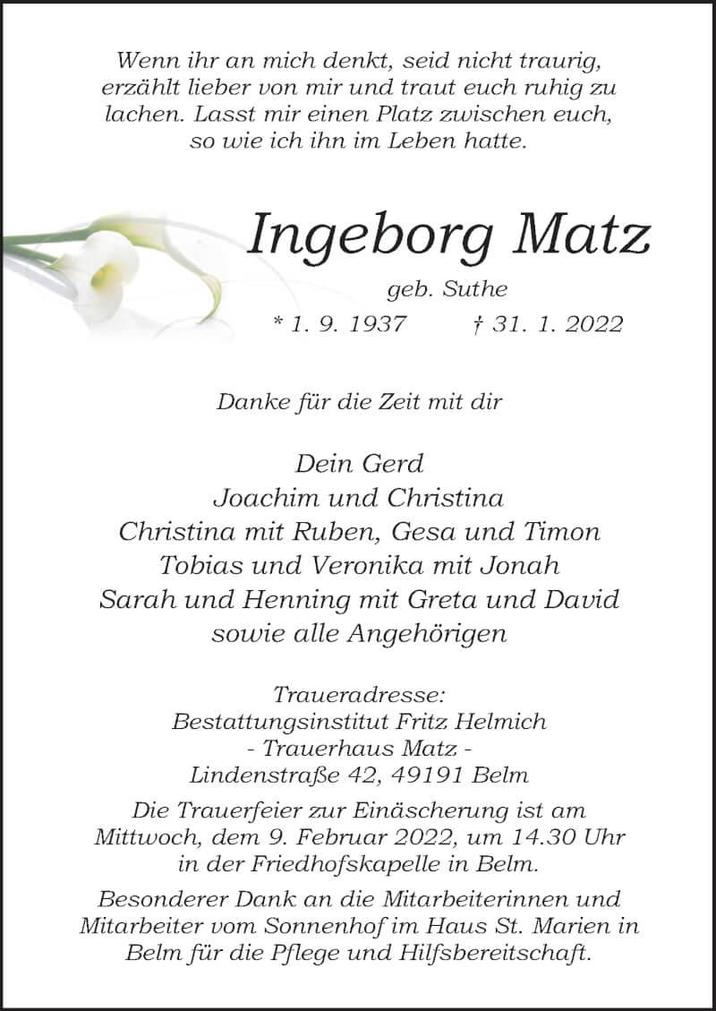 Hier finden Sie alle Traueranzeigen aus der Zeitung, die bisher für Ingeborg Matz erschienen sind. Weitere Traueranzeigen, die in der Zeitung erscheinen, werden hier ebenfalls aufgelistet