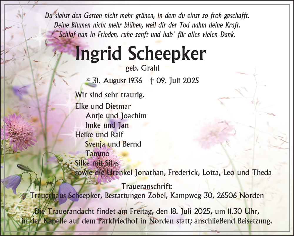 Hier finden Sie alle Traueranzeigen aus der Zeitung, die bisher für Ingrid Scheepker erschienen sind. Weitere Traueranzeigen, die in der Zeitung erscheinen, werden hier ebenfalls aufgelistet