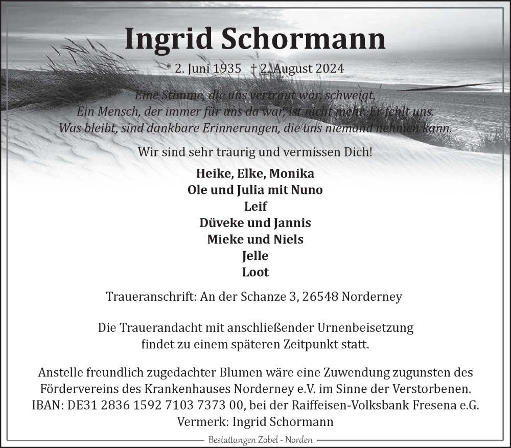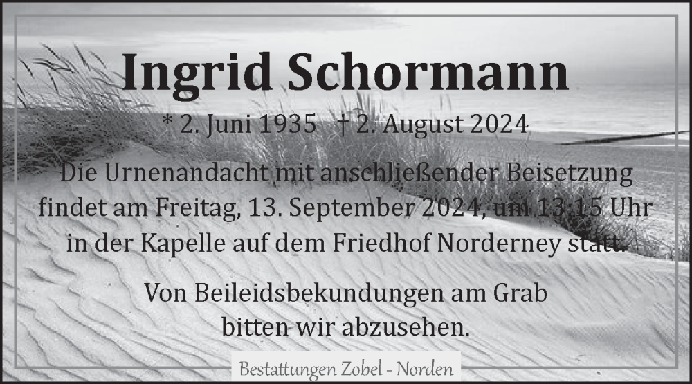 Hier finden Sie alle Traueranzeigen aus der Zeitung, die bisher für Ingrid Schormann erschienen sind. Weitere Traueranzeigen, die in der Zeitung erscheinen, werden hier ebenfalls aufgelistet