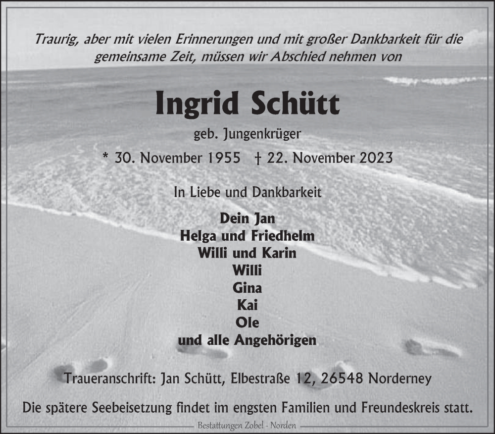 Hier finden Sie alle Traueranzeigen aus der Zeitung, die bisher für Ingrid Schütt erschienen sind. Weitere Traueranzeigen, die in der Zeitung erscheinen, werden hier ebenfalls aufgelistet