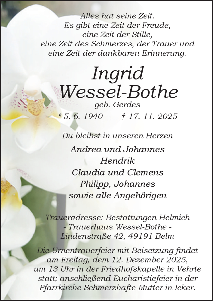 Hier finden Sie alle Traueranzeigen aus der Zeitung, die bisher für Ingrid Wessel-Bothe erschienen sind. Weitere Traueranzeigen, die in der Zeitung erscheinen, werden hier ebenfalls aufgelistet