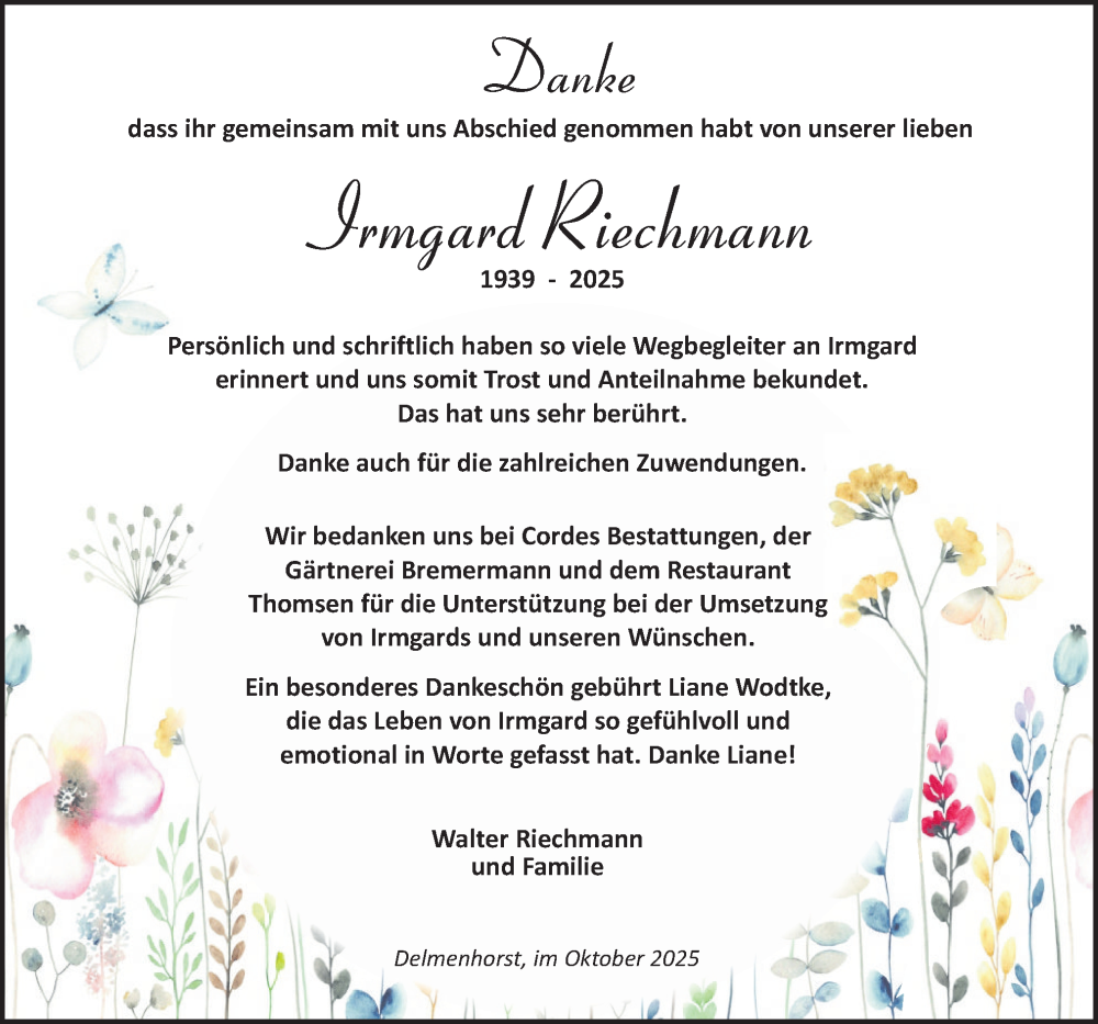 Hier finden Sie alle Traueranzeigen aus der Zeitung, die bisher für Irmgard Riechmann erschienen sind. Weitere Traueranzeigen, die in der Zeitung erscheinen, werden hier ebenfalls aufgelistet