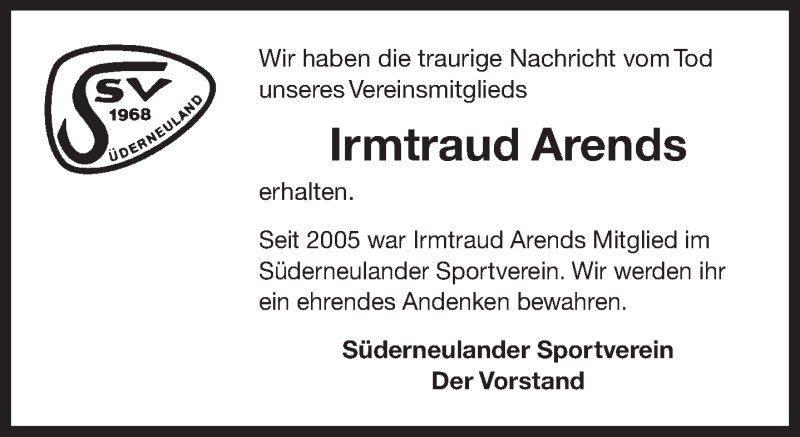 Hier finden Sie alle Traueranzeigen aus der Zeitung, die bisher für Irmtraud Arends erschienen sind. Weitere Traueranzeigen, die in der Zeitung erscheinen, werden hier ebenfalls aufgelistet