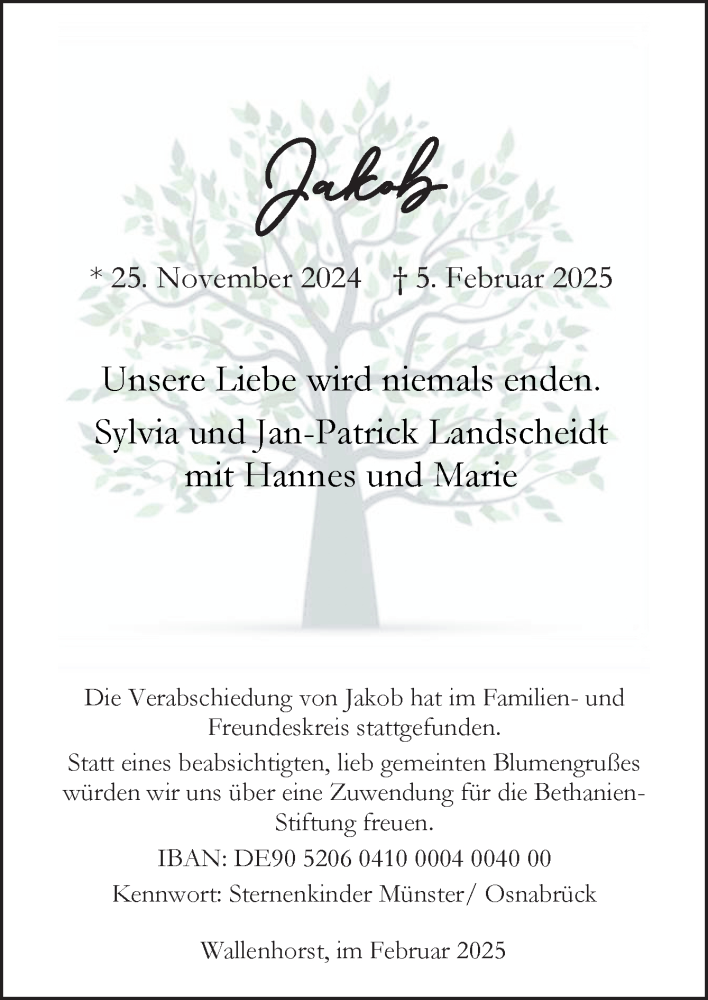 Hier finden Sie alle Traueranzeigen aus der Zeitung, die bisher für Jakob erschienen sind. Weitere Traueranzeigen, die in der Zeitung erscheinen, werden hier ebenfalls aufgelistet
