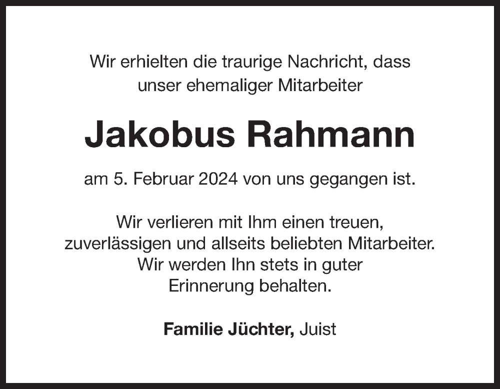 Hier finden Sie alle Traueranzeigen aus der Zeitung, die bisher für Jakobus Rahmann erschienen sind. Weitere Traueranzeigen, die in der Zeitung erscheinen, werden hier ebenfalls aufgelistet