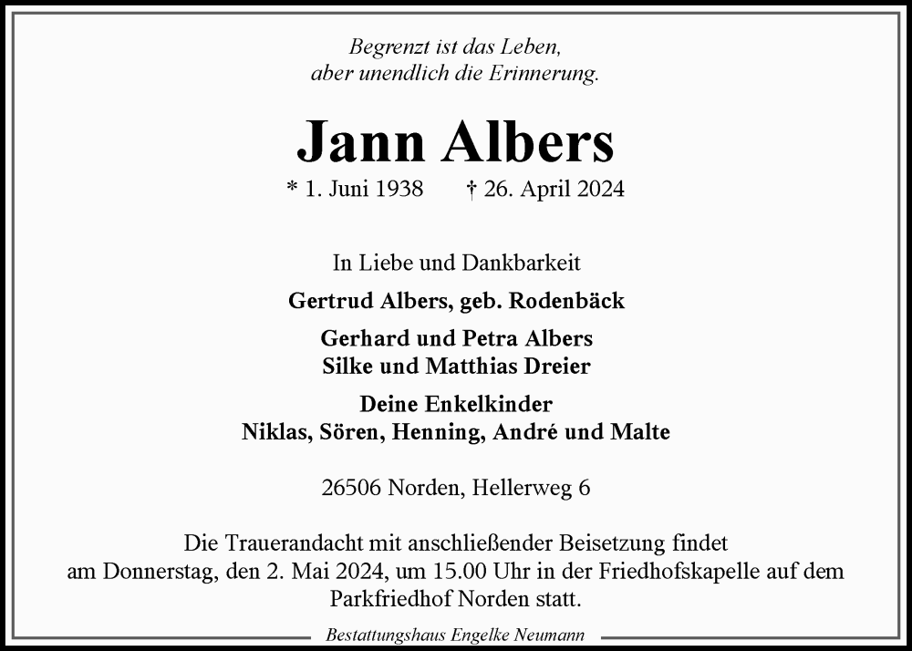 Hier finden Sie alle Traueranzeigen aus der Zeitung, die bisher für Jann Albers erschienen sind. Weitere Traueranzeigen, die in der Zeitung erscheinen, werden hier ebenfalls aufgelistet
