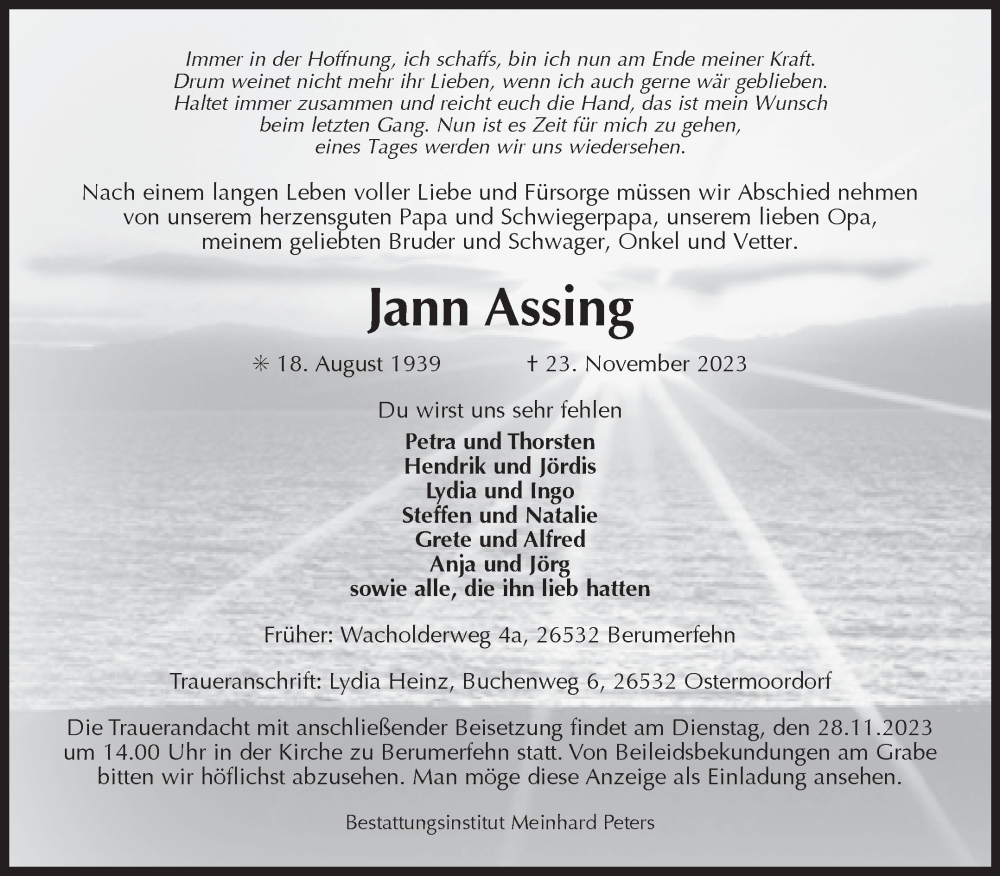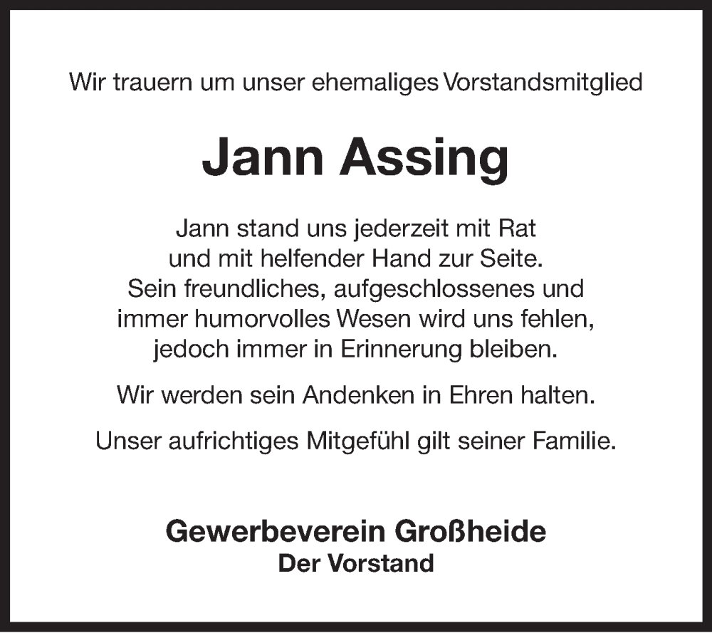 Hier finden Sie alle Traueranzeigen aus der Zeitung, die bisher für Jann Assing erschienen sind. Weitere Traueranzeigen, die in der Zeitung erscheinen, werden hier ebenfalls aufgelistet