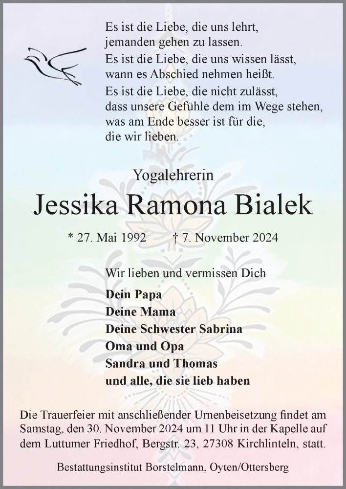 Hier finden Sie alle Traueranzeigen aus der Zeitung, die bisher für Jessika Ramona Bialek erschienen sind. Weitere Traueranzeigen, die in der Zeitung erscheinen, werden hier ebenfalls aufgelistet