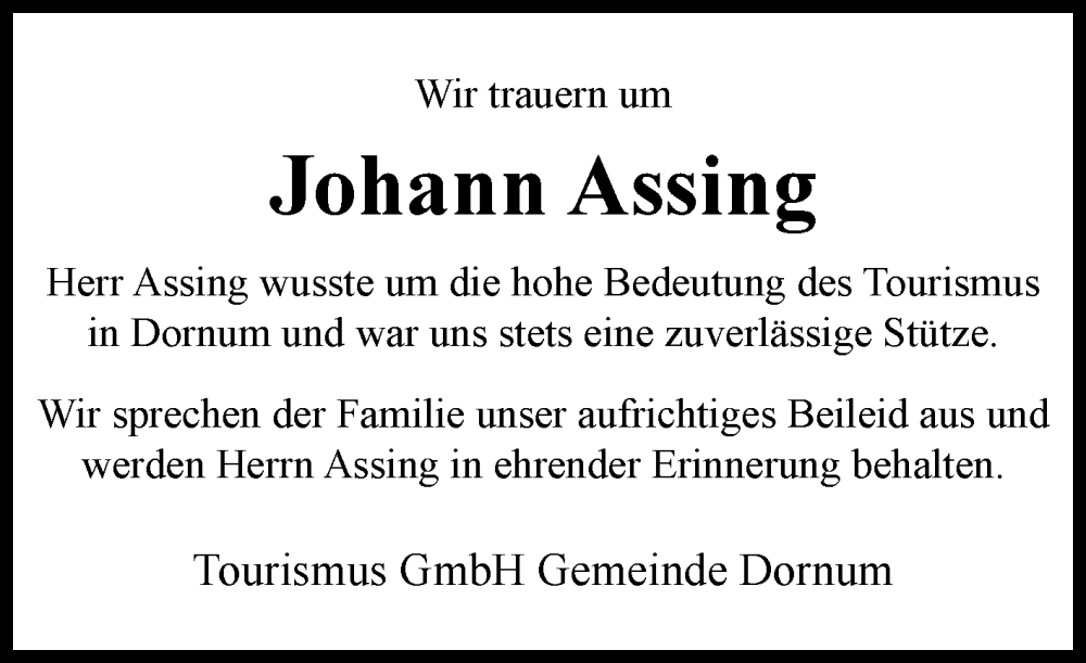Hier finden Sie alle Traueranzeigen aus der Zeitung, die bisher für Johann Assing erschienen sind. Weitere Traueranzeigen, die in der Zeitung erscheinen, werden hier ebenfalls aufgelistet