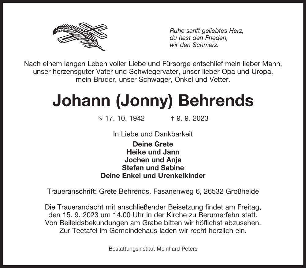 Hier finden Sie alle Traueranzeigen aus der Zeitung, die bisher für Johann Behrends erschienen sind. Weitere Traueranzeigen, die in der Zeitung erscheinen, werden hier ebenfalls aufgelistet