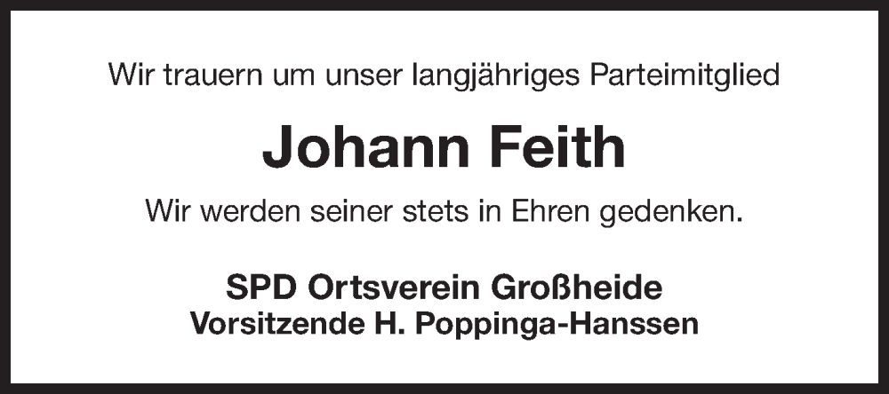 Hier finden Sie alle Traueranzeigen aus der Zeitung, die bisher für Johann Feith erschienen sind. Weitere Traueranzeigen, die in der Zeitung erscheinen, werden hier ebenfalls aufgelistet