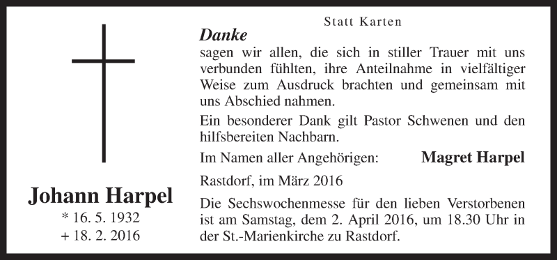 Hier finden Sie alle Traueranzeigen aus der Zeitung, die bisher für Johann Harpel erschienen sind. Weitere Traueranzeigen, die in der Zeitung erscheinen, werden hier ebenfalls aufgelistet