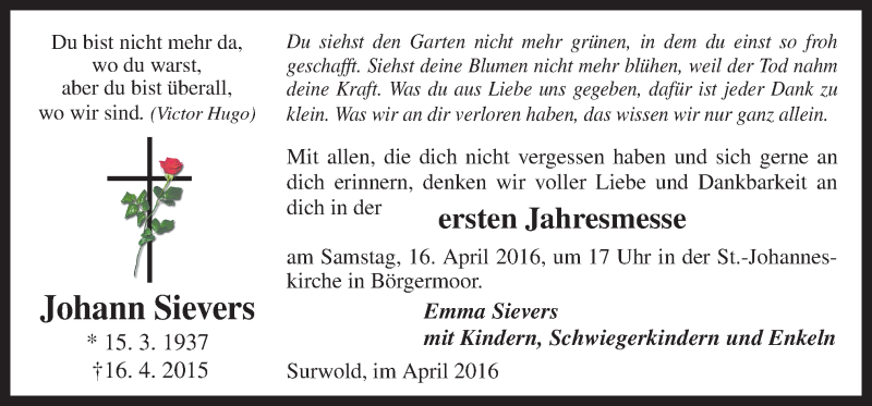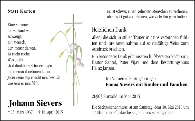Hier finden Sie alle Traueranzeigen aus der Zeitung, die bisher für Johann Sievers erschienen sind. Weitere Traueranzeigen, die in der Zeitung erscheinen, werden hier ebenfalls aufgelistet