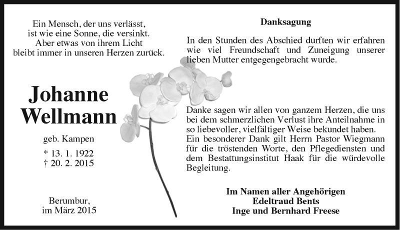 Hier finden Sie alle Traueranzeigen aus der Zeitung, die bisher für Johanne Wellmann erschienen sind. Weitere Traueranzeigen, die in der Zeitung erscheinen, werden hier ebenfalls aufgelistet