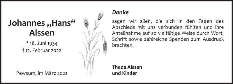 Hier finden Sie alle Traueranzeigen aus der Zeitung, die bisher für Johannes Aissen erschienen sind. Weitere Traueranzeigen, die in der Zeitung erscheinen, werden hier ebenfalls aufgelistet