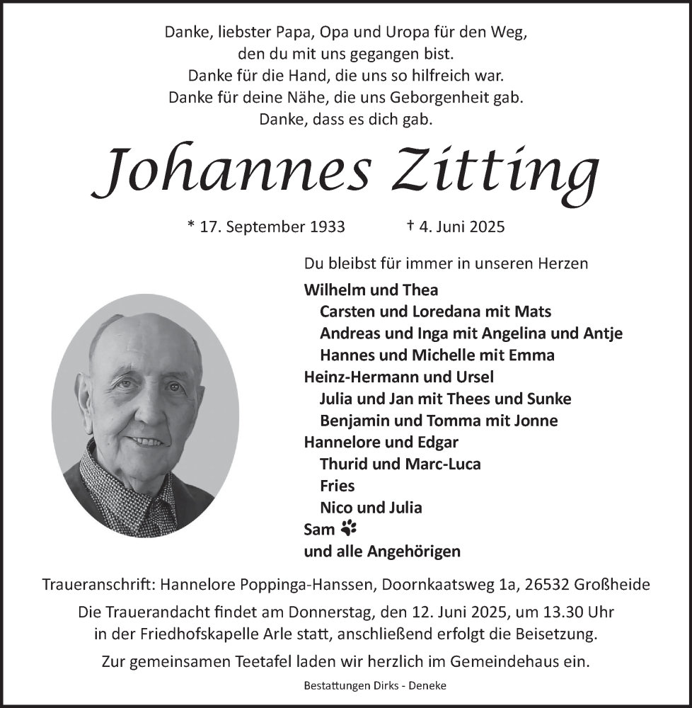 Hier finden Sie alle Traueranzeigen aus der Zeitung, die bisher für Johannes Zitting erschienen sind. Weitere Traueranzeigen, die in der Zeitung erscheinen, werden hier ebenfalls aufgelistet