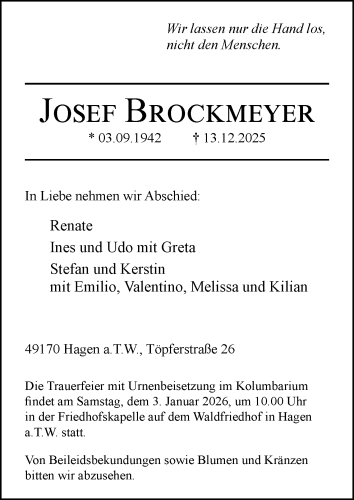 Hier finden Sie alle Traueranzeigen aus der Zeitung, die bisher für Josef Brockmeyer erschienen sind. Weitere Traueranzeigen, die in der Zeitung erscheinen, werden hier ebenfalls aufgelistet
