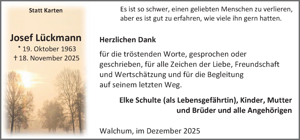 Hier finden Sie alle Traueranzeigen aus der Zeitung, die bisher für Josef Lückmann erschienen sind. Weitere Traueranzeigen, die in der Zeitung erscheinen, werden hier ebenfalls aufgelistet