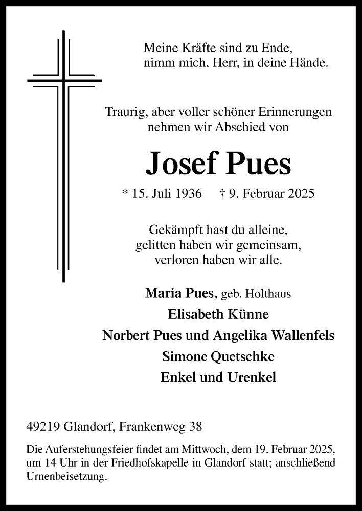 Hier finden Sie alle Traueranzeigen aus der Zeitung, die bisher für Josef Pues erschienen sind. Weitere Traueranzeigen, die in der Zeitung erscheinen, werden hier ebenfalls aufgelistet