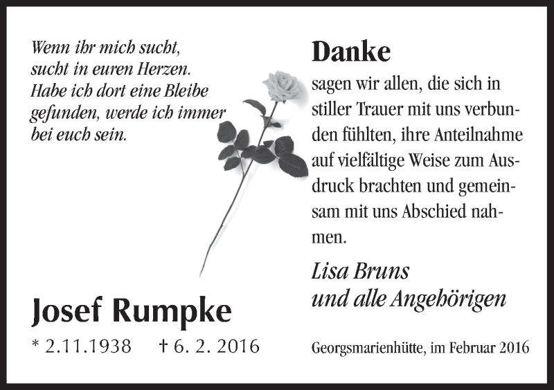 Hier finden Sie alle Traueranzeigen aus der Zeitung, die bisher für Josef Rumpke erschienen sind. Weitere Traueranzeigen, die in der Zeitung erscheinen, werden hier ebenfalls aufgelistet