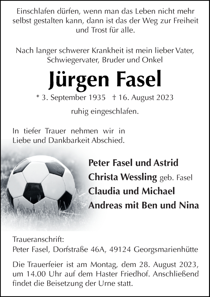 Hier finden Sie alle Traueranzeigen aus der Zeitung, die bisher für Jürgen Fasel erschienen sind. Weitere Traueranzeigen, die in der Zeitung erscheinen, werden hier ebenfalls aufgelistet