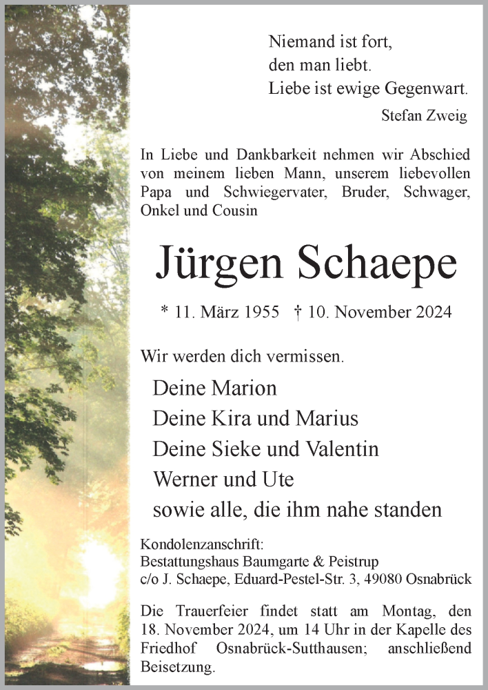 Hier finden Sie alle Traueranzeigen aus der Zeitung, die bisher für Jürgen Schaepe erschienen sind. Weitere Traueranzeigen, die in der Zeitung erscheinen, werden hier ebenfalls aufgelistet