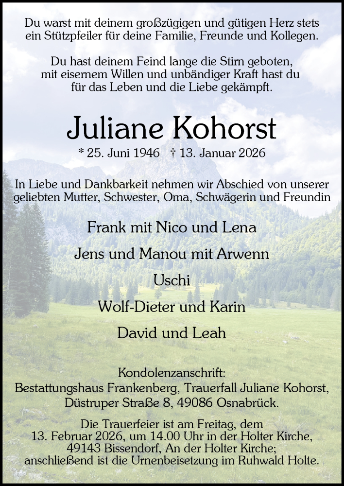 Hier finden Sie alle Traueranzeigen aus der Zeitung, die bisher für Juliane Kohorst erschienen sind. Weitere Traueranzeigen, die in der Zeitung erscheinen, werden hier ebenfalls aufgelistet