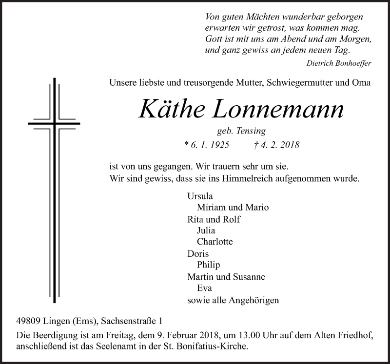 Hier finden Sie alle Traueranzeigen aus der Zeitung, die bisher für Käthe Lonnemann erschienen sind. Weitere Traueranzeigen, die in der Zeitung erscheinen, werden hier ebenfalls aufgelistet