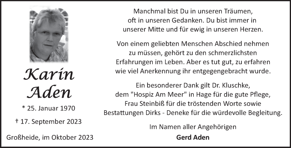 Hier finden Sie alle Traueranzeigen aus der Zeitung, die bisher für Karin Aden erschienen sind. Weitere Traueranzeigen, die in der Zeitung erscheinen, werden hier ebenfalls aufgelistet