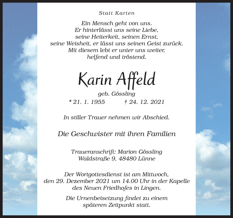 Hier finden Sie alle Traueranzeigen aus der Zeitung, die bisher für Karin Affeld erschienen sind. Weitere Traueranzeigen, die in der Zeitung erscheinen, werden hier ebenfalls aufgelistet