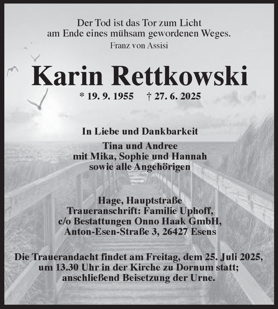 Hier finden Sie alle Traueranzeigen aus der Zeitung, die bisher für Karin Rettkowski erschienen sind. Weitere Traueranzeigen, die in der Zeitung erscheinen, werden hier ebenfalls aufgelistet