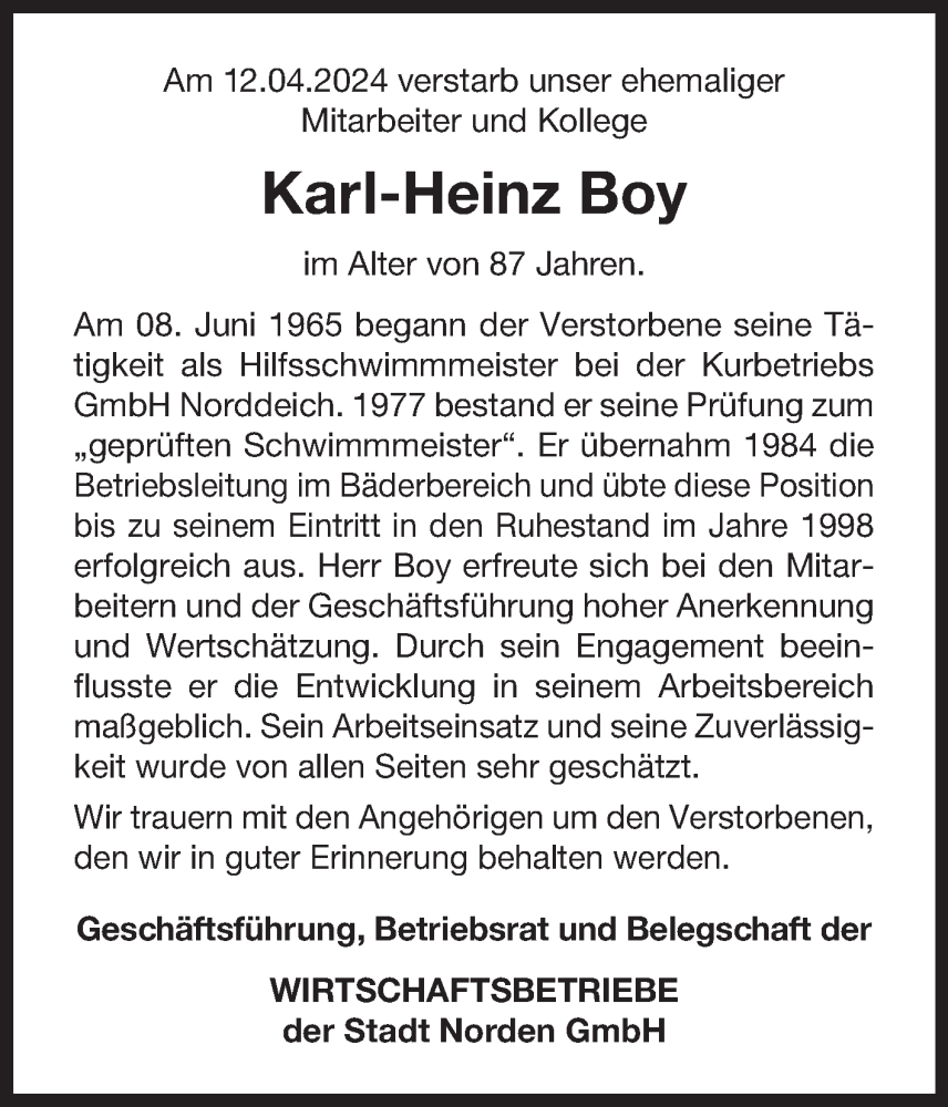 Hier finden Sie alle Traueranzeigen aus der Zeitung, die bisher für Karl-Heinz Boy erschienen sind. Weitere Traueranzeigen, die in der Zeitung erscheinen, werden hier ebenfalls aufgelistet