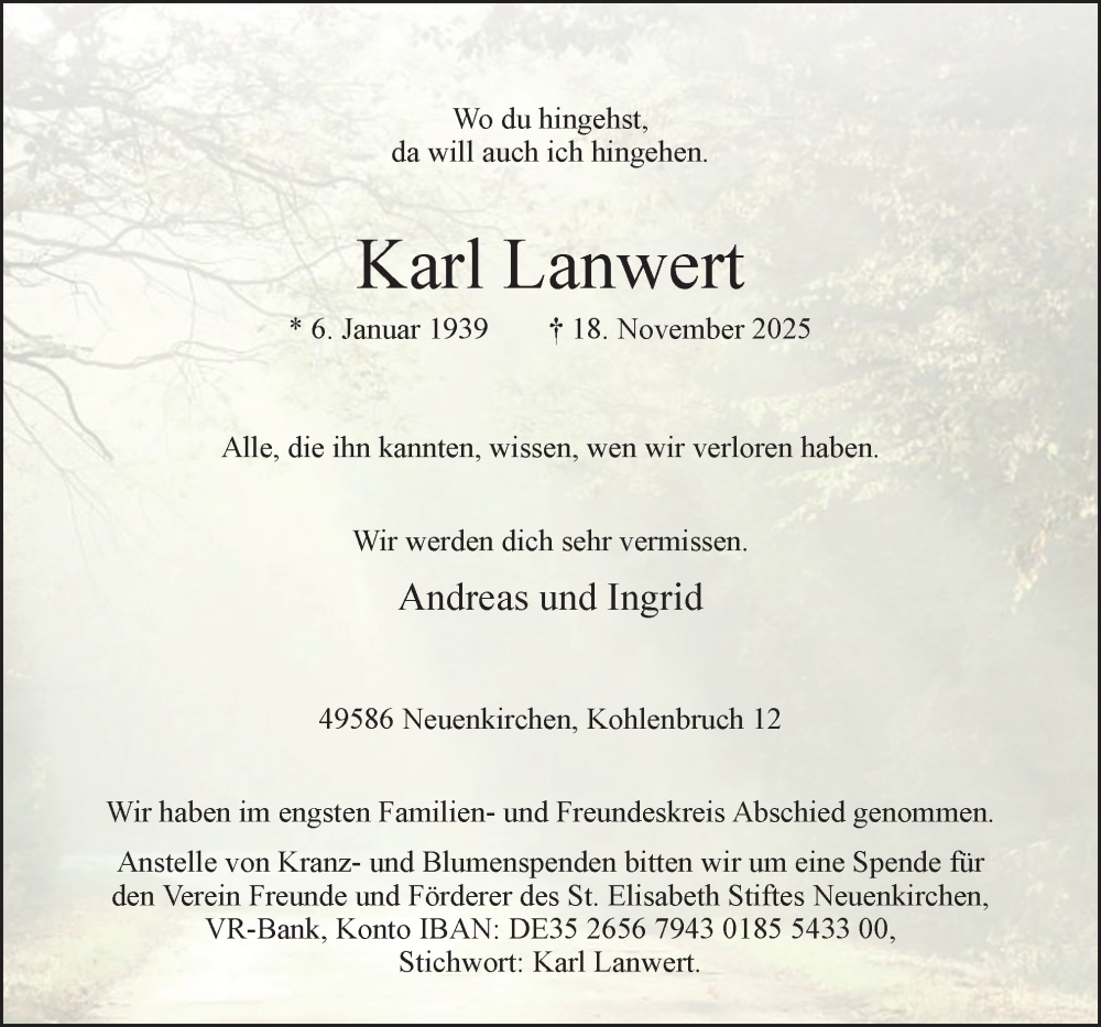 Hier finden Sie alle Traueranzeigen aus der Zeitung, die bisher für Karl Lanwert erschienen sind. Weitere Traueranzeigen, die in der Zeitung erscheinen, werden hier ebenfalls aufgelistet