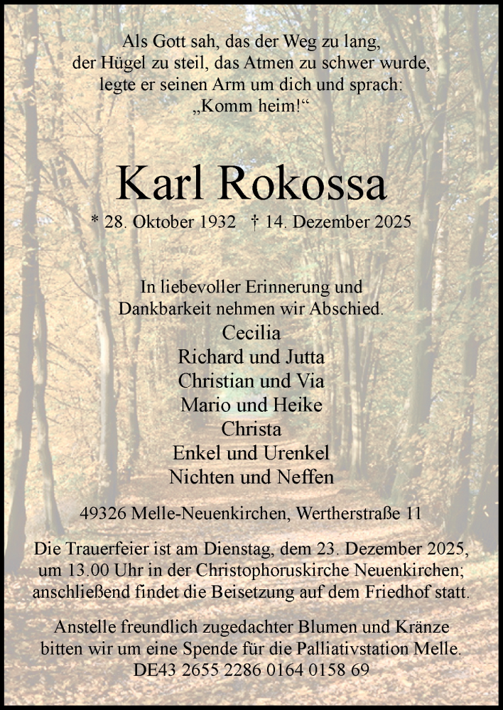 Hier finden Sie alle Traueranzeigen aus der Zeitung, die bisher für Karl Rokossa erschienen sind. Weitere Traueranzeigen, die in der Zeitung erscheinen, werden hier ebenfalls aufgelistet