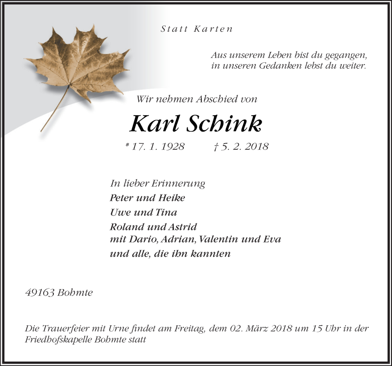 Hier finden Sie alle Traueranzeigen aus der Zeitung, die bisher für Karl Schink erschienen sind. Weitere Traueranzeigen, die in der Zeitung erscheinen, werden hier ebenfalls aufgelistet