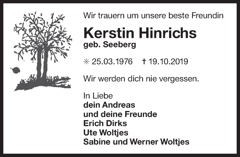 Hier finden Sie alle Traueranzeigen aus der Zeitung, die bisher für Kerstin Hinrichs erschienen sind. Weitere Traueranzeigen, die in der Zeitung erscheinen, werden hier ebenfalls aufgelistet