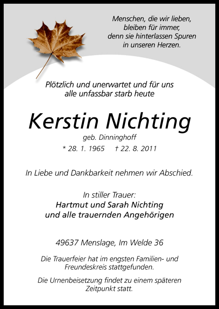 Hier finden Sie alle Traueranzeigen aus der Zeitung, die bisher für Kerstin Nichting erschienen sind. Weitere Traueranzeigen, die in der Zeitung erscheinen, werden hier ebenfalls aufgelistet