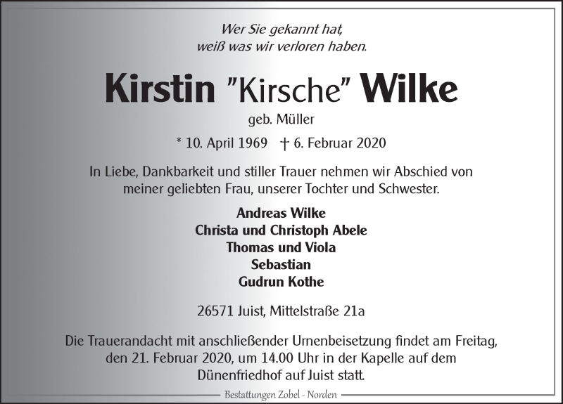 Hier finden Sie alle Traueranzeigen aus der Zeitung, die bisher für Kirstin Wilke erschienen sind. Weitere Traueranzeigen, die in der Zeitung erscheinen, werden hier ebenfalls aufgelistet
