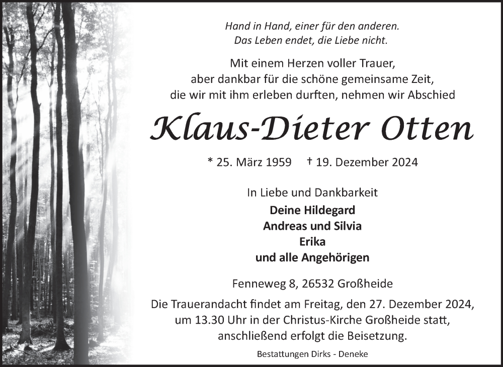 Hier finden Sie alle Traueranzeigen aus der Zeitung, die bisher für Klaus-Dieter Otten erschienen sind. Weitere Traueranzeigen, die in der Zeitung erscheinen, werden hier ebenfalls aufgelistet
