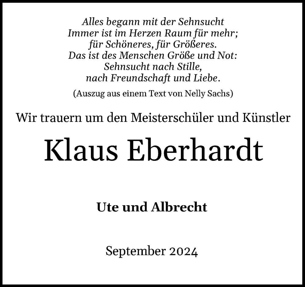 Hier finden Sie alle Traueranzeigen aus der Zeitung, die bisher für Klaus Eberhardt erschienen sind. Weitere Traueranzeigen, die in der Zeitung erscheinen, werden hier ebenfalls aufgelistet