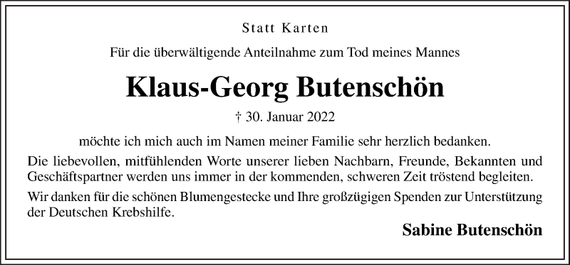 Hier finden Sie alle Traueranzeigen aus der Zeitung, die bisher für Klaus-Georg Butenschön erschienen sind. Weitere Traueranzeigen, die in der Zeitung erscheinen, werden hier ebenfalls aufgelistet