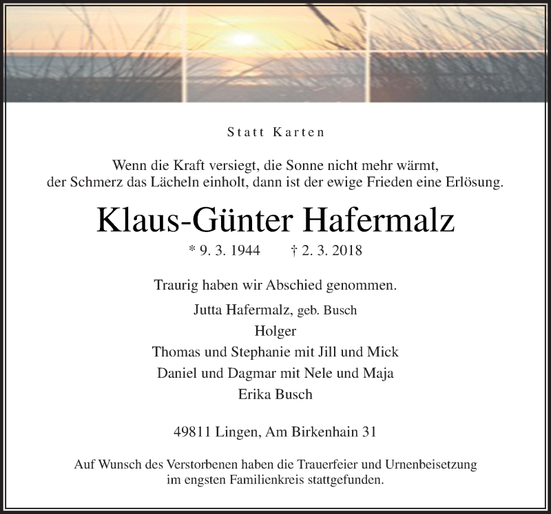 Hier finden Sie alle Traueranzeigen aus der Zeitung, die bisher für Klaus-Günter Hafermalz erschienen sind. Weitere Traueranzeigen, die in der Zeitung erscheinen, werden hier ebenfalls aufgelistet