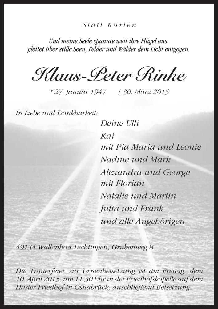 Hier finden Sie alle Traueranzeigen aus der Zeitung, die bisher für Klaus-Peter Rinke erschienen sind. Weitere Traueranzeigen, die in der Zeitung erscheinen, werden hier ebenfalls aufgelistet