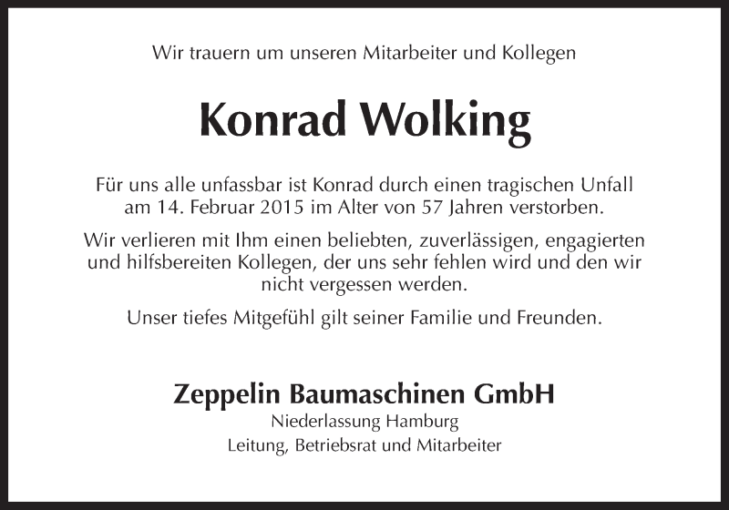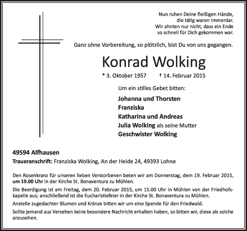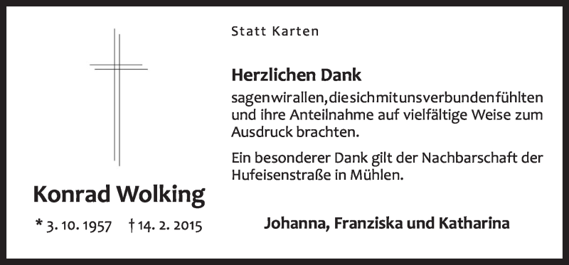 Hier finden Sie alle Traueranzeigen aus der Zeitung, die bisher für Konrad Wolking erschienen sind. Weitere Traueranzeigen, die in der Zeitung erscheinen, werden hier ebenfalls aufgelistet