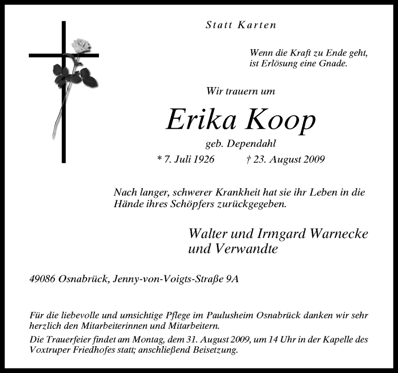 Hier finden Sie alle Traueranzeigen aus der Zeitung, die bisher für Erika Koop erschienen sind. Weitere Traueranzeigen, die in der Zeitung erscheinen, werden hier ebenfalls aufgelistet