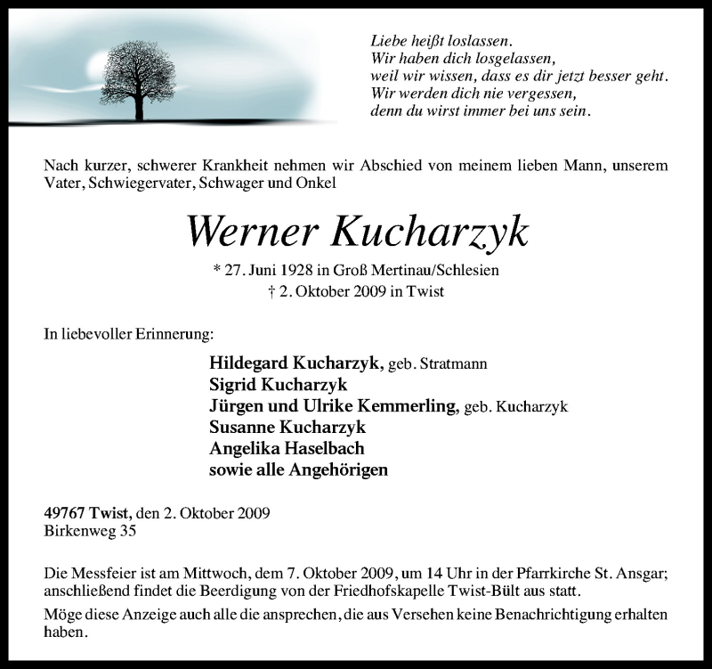 Hier finden Sie alle Traueranzeigen aus der Zeitung, die bisher für Werner Kucharzyk erschienen sind. Weitere Traueranzeigen, die in der Zeitung erscheinen, werden hier ebenfalls aufgelistet