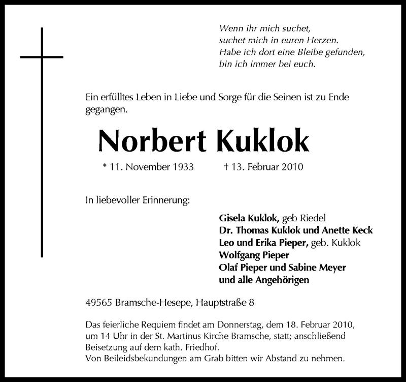 Hier finden Sie alle Traueranzeigen aus der Zeitung, die bisher für Norbert Kuklok erschienen sind. Weitere Traueranzeigen, die in der Zeitung erscheinen, werden hier ebenfalls aufgelistet