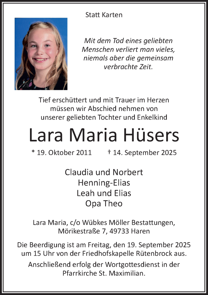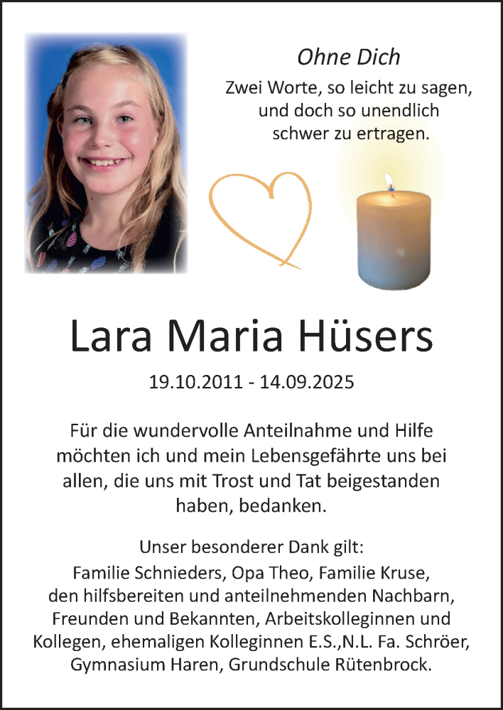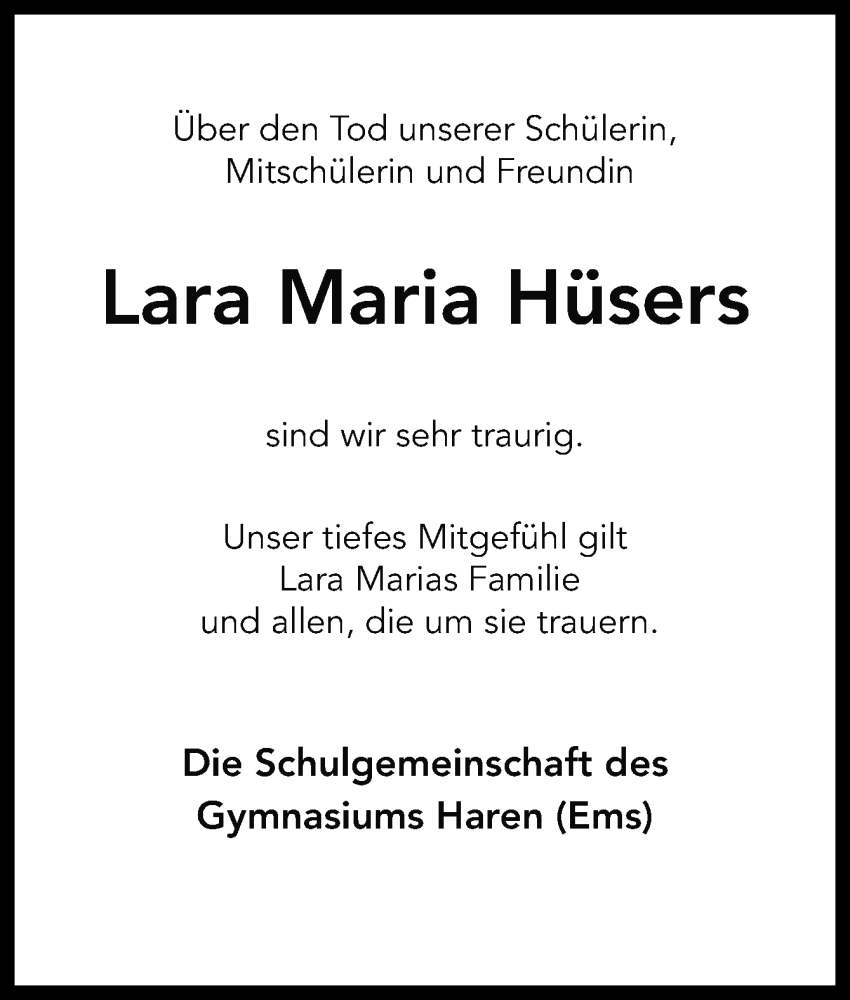 Hier finden Sie alle Traueranzeigen aus der Zeitung, die bisher für Lara Maria Hüsers erschienen sind. Weitere Traueranzeigen, die in der Zeitung erscheinen, werden hier ebenfalls aufgelistet