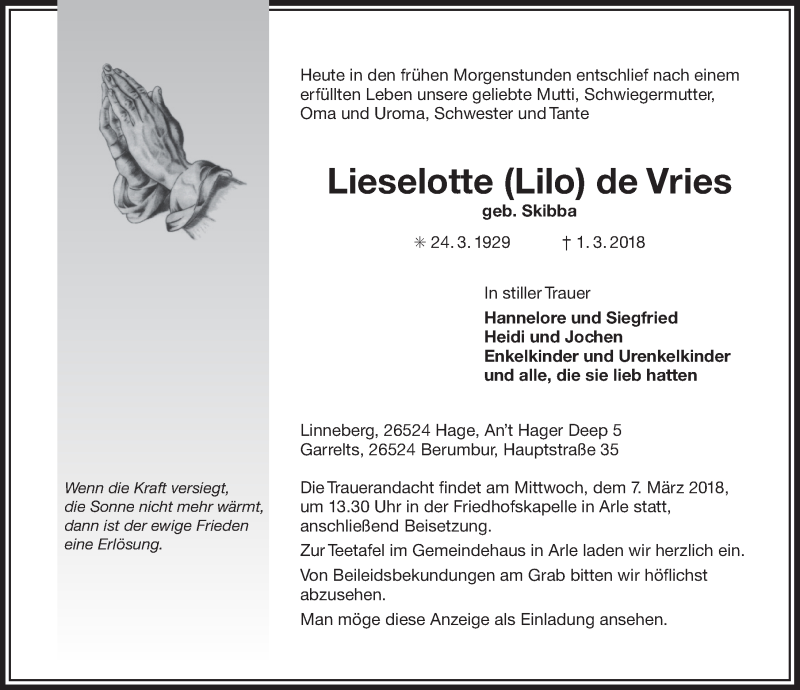 Hier finden Sie alle Traueranzeigen aus der Zeitung, die bisher für Lieselotte de Vries erschienen sind. Weitere Traueranzeigen, die in der Zeitung erscheinen, werden hier ebenfalls aufgelistet